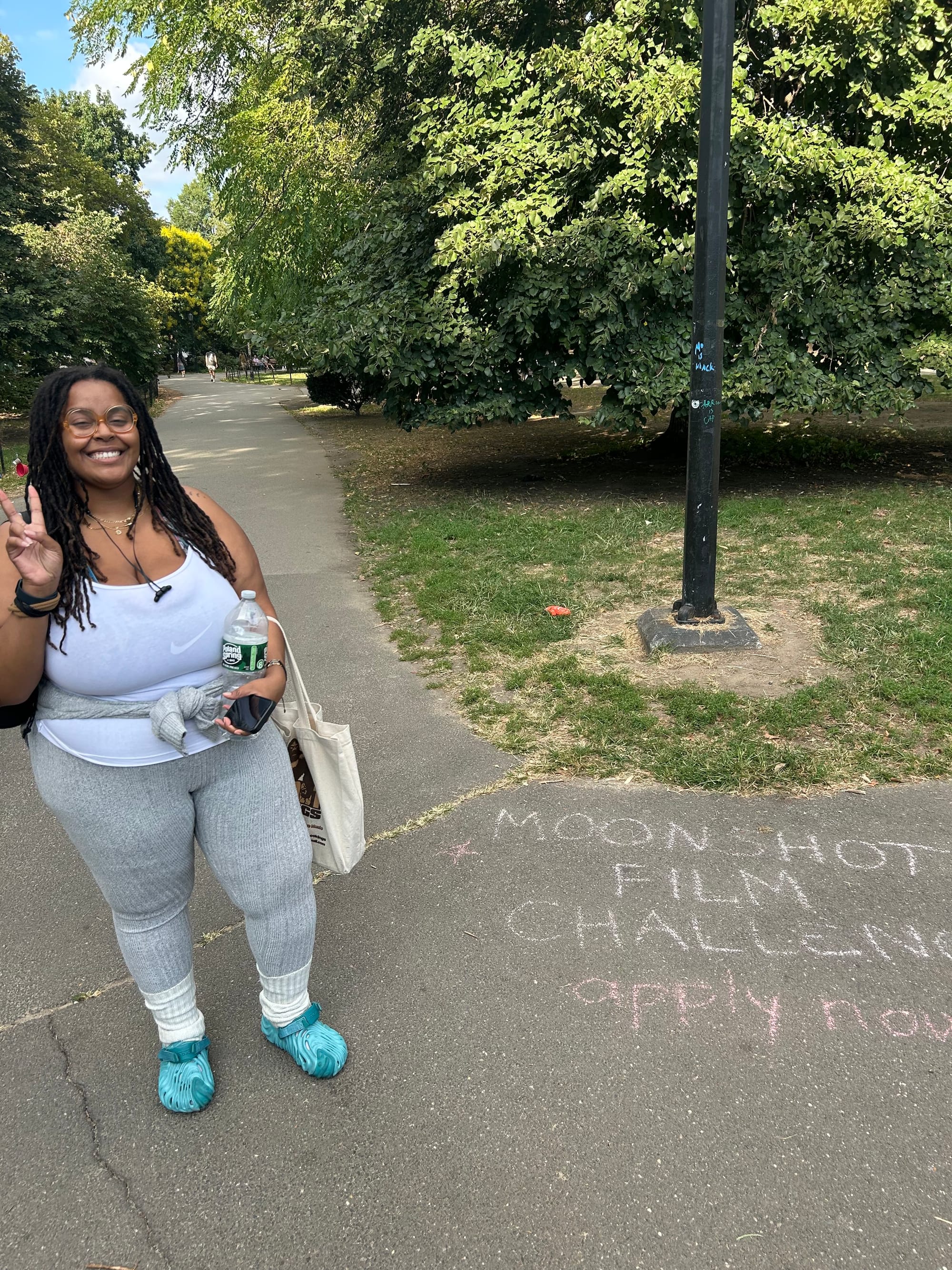Others have been listening, too. When Kelly and I split up for the day, she tells me she has to head home and prepare to lay down vocals for a Jay Electronica song later that night. Those vocals appeared on “...shine for me,” a standout track that she has all to herself on A Written Testimony: Mars, The Uninhabited Planet, one of several projects the elusive New Orleans rapper dropped out of the blue a few weekends ago. That kind of look coming her way not even a month after dropping her debut album is monumental and well-earned. To be honest, I should’ve seen it coming. We cut through McCarren Park to get to the train station, and about halfway through, we stumbled on a message scrawled out in sidewalk chalk that was too on the nose to ignore. I told Kelly to go stand next to it while I snapped a picture—maybe for the future, maybe as a reminder that we never know where this life will take us. The first word in that sentence? "Moonshot."