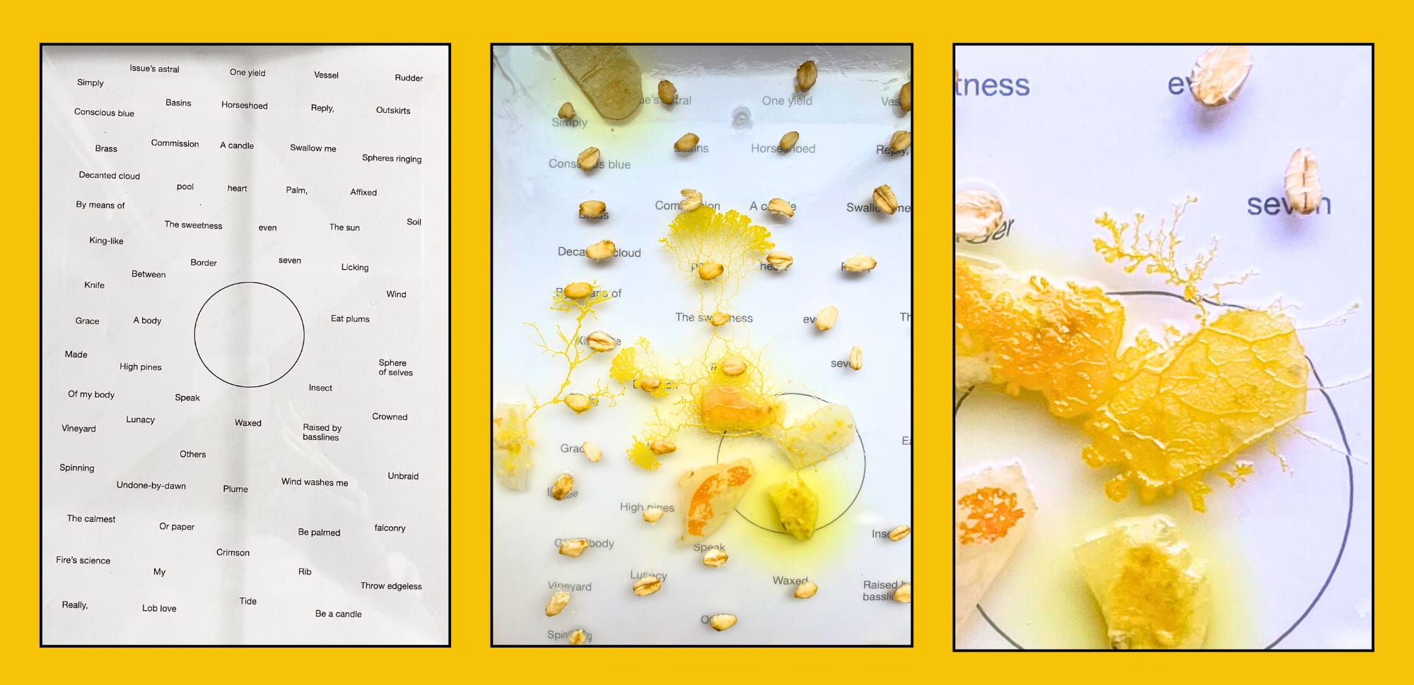 The album’s wildest experiment involved collaborating with an entity you might actually find in a science laboratory: slime mold. Looking to work with language more on Hymnal, Pramuk enlisted her friend Nadia Marcus to write poems for the album—but she didn’t want to just sing them. So she asked another friend, the biological artist Jenna Sutela, to help her acquire slime mold and let the mold choose the words she would vocalize. “We made something like a bingo board with a few key phrases from the poems, and put the slime mold in each corner and let them grow over the board,” Pramuk says. She took photos of the board for seven days, tracking the mold’s path, and then created a visual map that she used for her vocal sessions. “I was limited to go only in the direction that the slime mold went, and only to adjacent words,” she says. “It was like a randomized limitation system, and a collaboration with this incredible creature.”