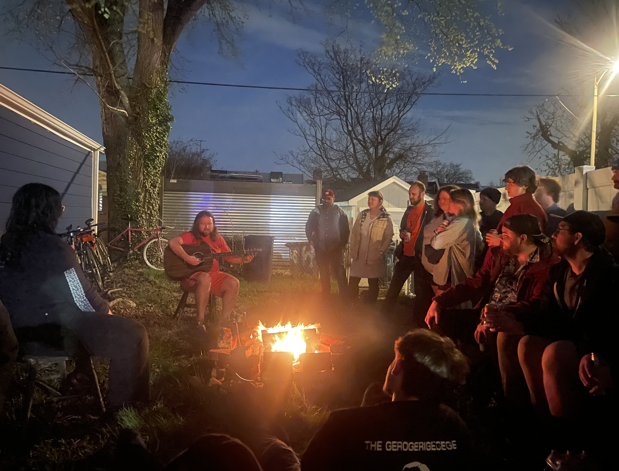 It’s dark and there’s a fire going in the backyard by the time Frank plays. He’s got his Minions Crocs and gym shorts on, topped this time with a faded T-shirt for a roller coaster called the Maverick. He sits with his guitar at the fire’s edge and people gather around to listen, leaning against the fence or sitting cross-legged in the grass. The early spring air is alive with the hissing and cracking of Budweisers and Modelos. Frank plays for an hour and a half, a long set by any standard. There’s no amplifier or P.A., and I’m struck in a new way by the delicacy of his fingerpicking as it rings out into the evening, interrupted only occasionally by a neighbor down the block operating a power tool. Frank gets a good bit going about how the neighbor is accompanying him on an instrument called an electric sharter. The “Art Is Over” kid laughs so hard at the dead chihuahua story that I worry he might throw up. I notice that Vinny, who had been hovering near the back gate, has turned his Yankee cap backwards and sat on the ground, where he will remain for the entire set, Jeopardy! be damned.
