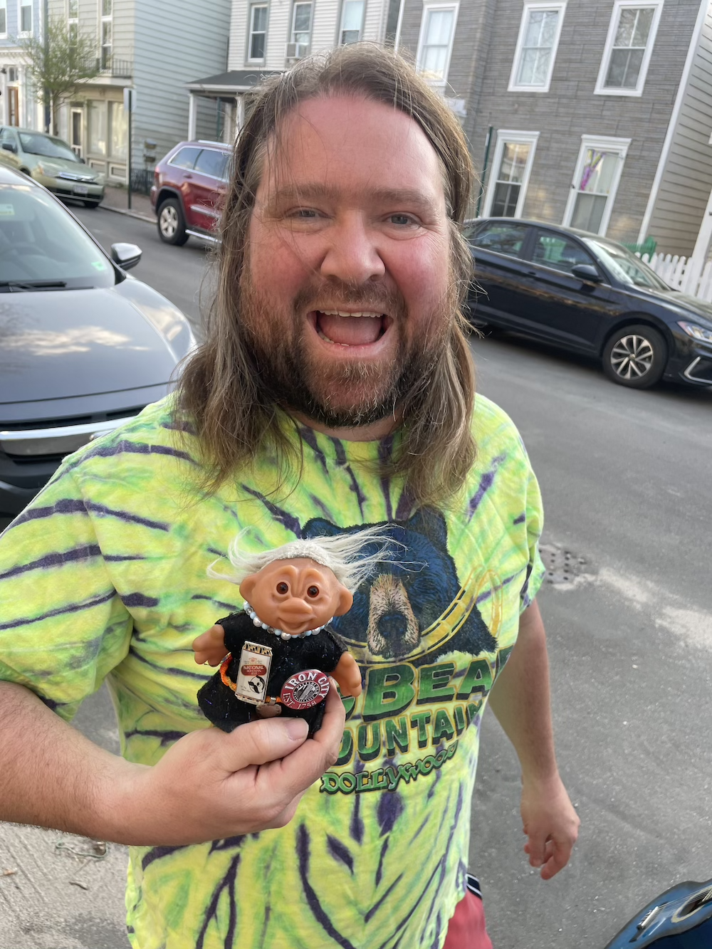 In between house shows on Frank’s current tour, he played a few dates in much bigger rooms, opening for Ryan Davis & the Roadhouse Band. Frank’s industry profile is low enough that Davis had to do a bit of explaining to the shows’ organizers about who he is and why the band wanted him to open. Frank is ruddy, bearded, longhaired, and sturdily built, or, in his own parlance, girthed. He can often be found wearing gym shorts, a roller coaster T-shirt, and Crocs shaped like Minions, with googly eyeballs on the ankle bands. There was some skepticism among venue staff. “He soundchecks for a minute and a half, and it’s always fun to watch the sound people be like, What is this guy’s deal?” Davis says. “And then after they see him connect with an audience, they’re like, OK, I get it now. You just put him in front of a room, he does his thing, and everybody’s in a good mood.”